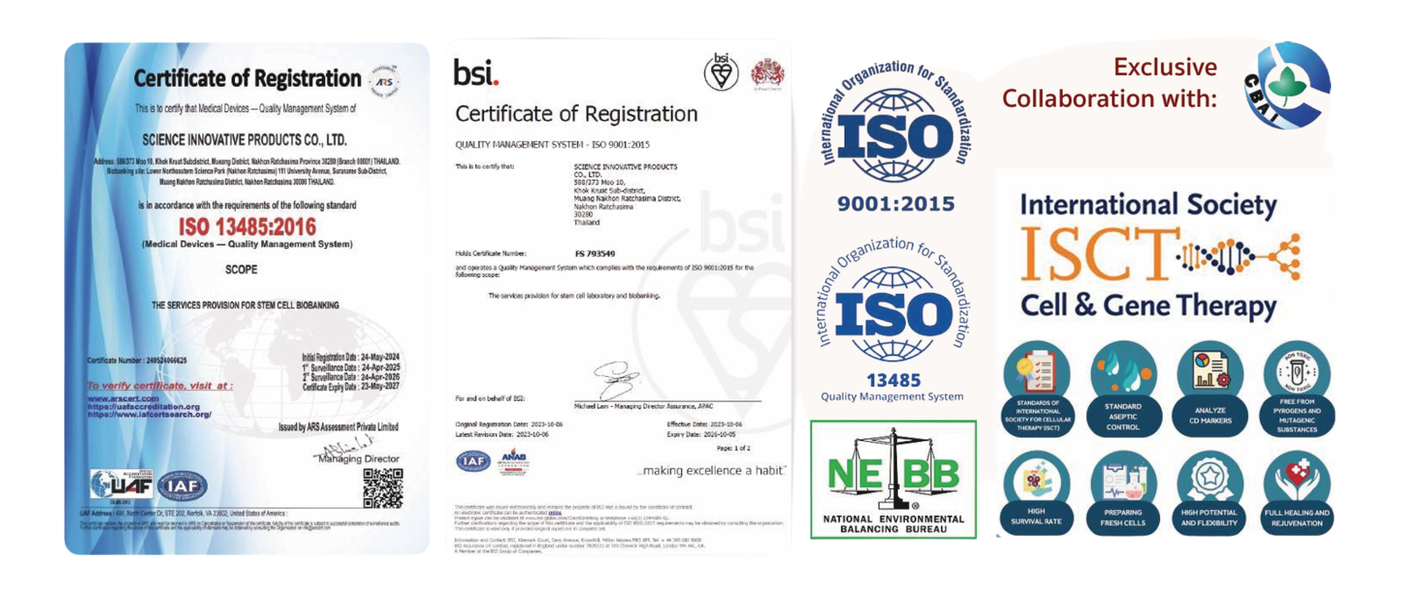 SCLI Biobanking ได้มาตรฐานสมาคมนานาชาติเพื่อการบำบัดด้วยเซลล์และยีน ISCT (International Society for Cell & Gene Therapy) ซึ่งเป็นองค์กรชั้นนำด้านเซลล์บำบัดและยีนบำบัด มาตรฐานนี้ช่วยให้มั่นใจว่าเซลล์ต้นกำเนิดที่ฝากกับเราสามารถนำไปใช้ในการรักษาและฟื้นฟูสุขภาพได้อย่างมีประสิทธิภาพ