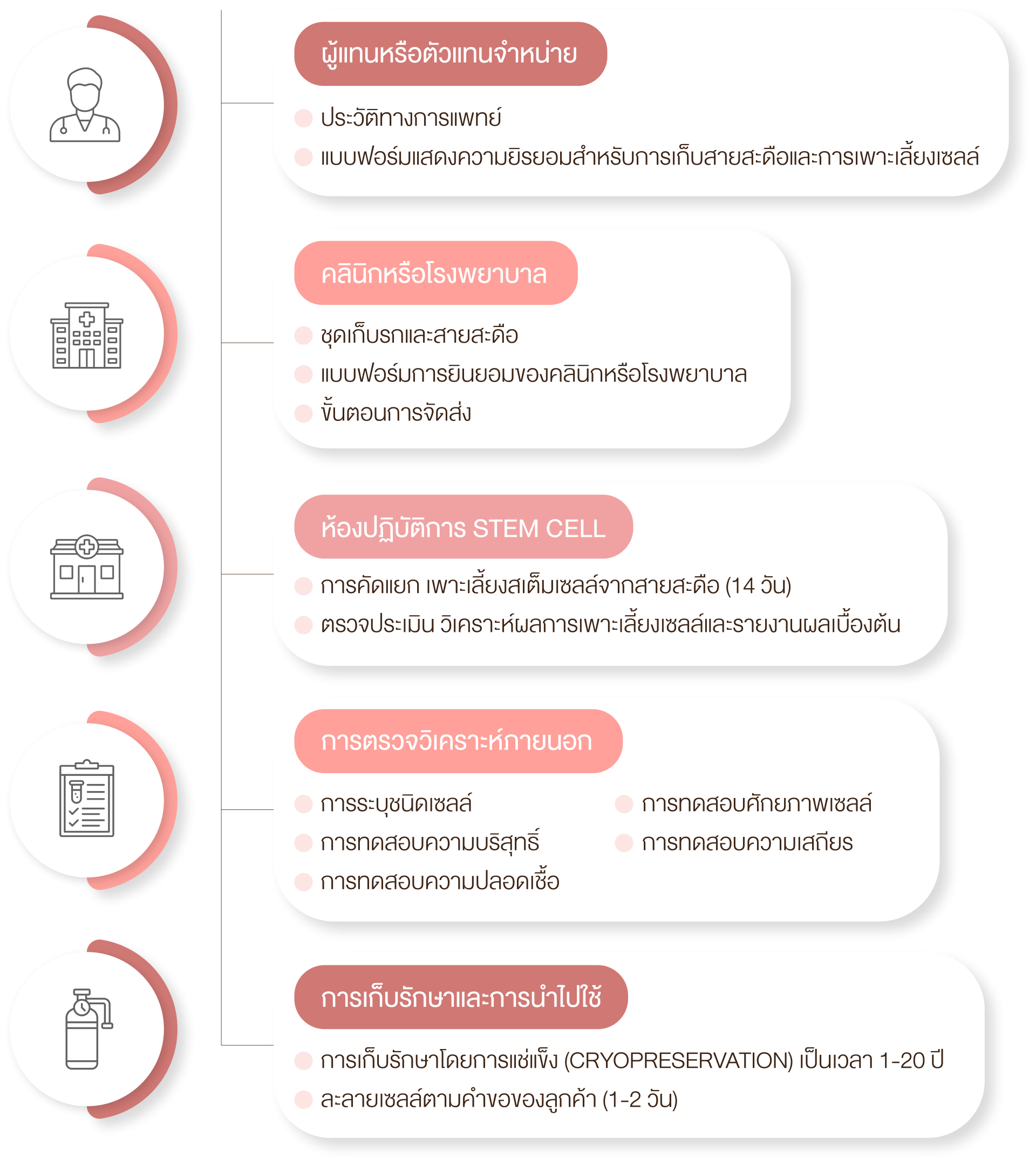 เซลล์ต้นกำเนิดจากสายสะดือสามารถเก็บรักษาในอุณหภูมิ -196°C โดยใช้ระบบ Liquid Nitrogen คุณภาพของเซลล์จะถูกเก็บรักษาไว้อย่างสมบูรณ์เป็นเวลาหลายสิบปี